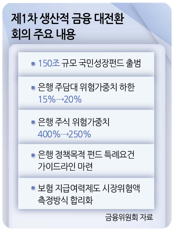 금융위는 금융감독 전반의 개선을 통해 업권별 특성을 살린 생산적 금융의 역할을 확립하기로 했다. 부동산에 대한 위험가중치를 높이는 동시에 주식에 대한 위험가중치를 낮춰 은행권이 보다 생산적 분야로 자금을 투입하도록 유도하는 장치를 마련했다. 펀드에 대해서도 특례 요건에 대한 명확한 가이드라인을 마련한다. 가이드라인에는 ▷법제화된 프로그램 이외 정부정책 발표 사업 ▷지자체 및 정책금융기관의 보조 또는 투자 ▷동순위·후순위 투자 이상인 경우 ▷금융당국 감독, 투자 대상 기업 규모 등 내용이 담길 예정이다. 기타 펀드 위험가중치 산출과 관련해 불명확한 사항도 개선한다.