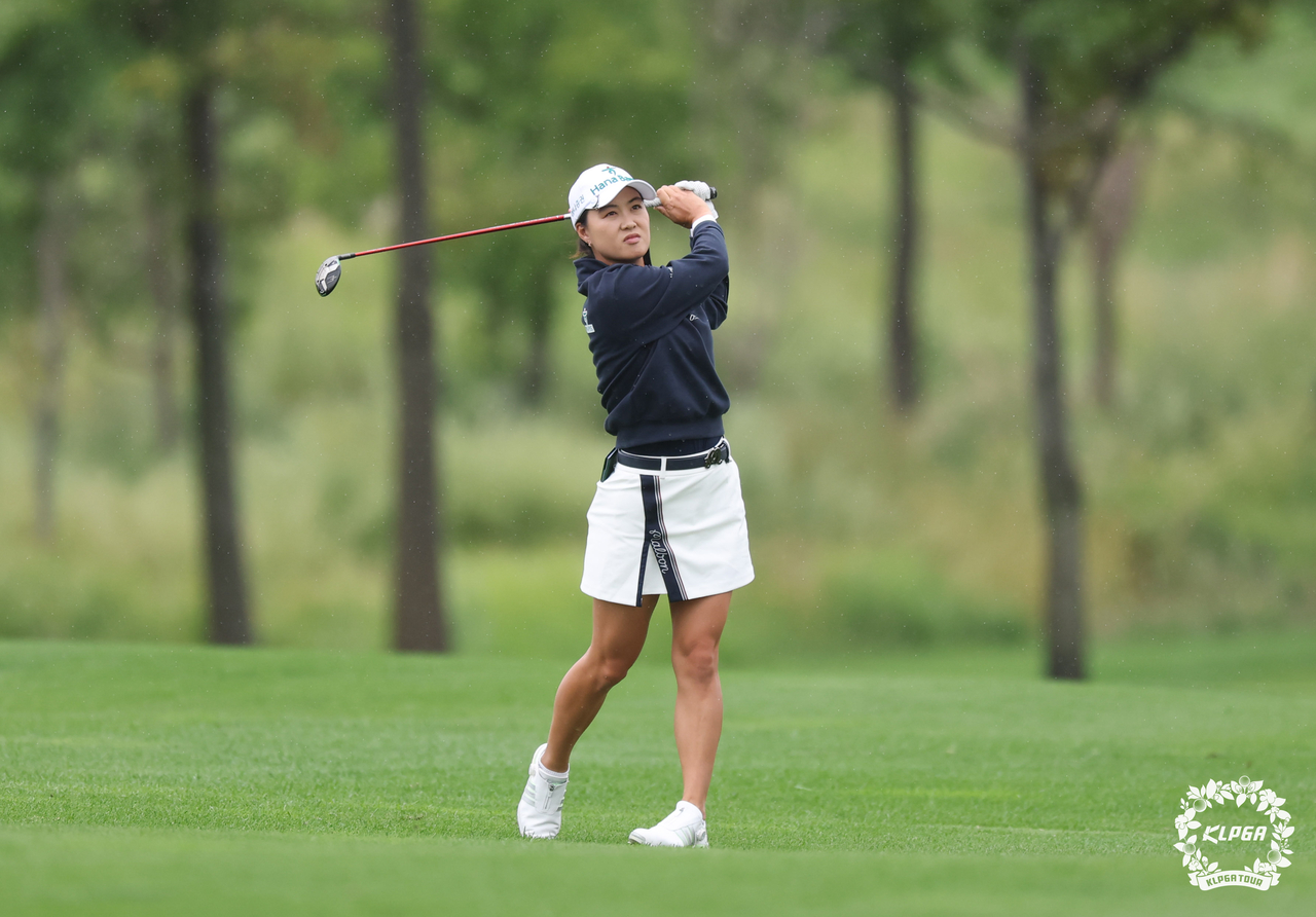 | 이민지가 19일 인천시 베어즈베스트 청라 골프클럽에서 열린 KLPGA 투어 하나금융그룹 챔피언십 2라운드 4번홀에서 세컨드샷을 하고 있다. [KLPGA 제공] |