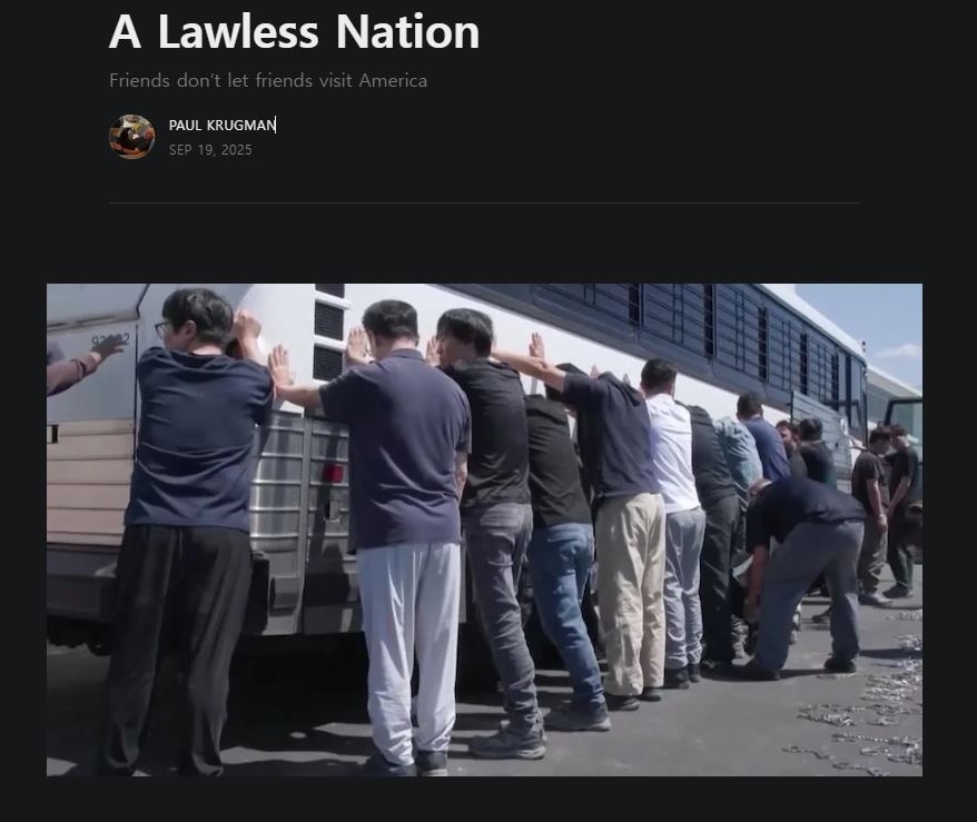 크루그먼 교수는 이날 온라인 뉴스레터 발행 플랫폼 서브스택(substack)에 ‘무법 국가(a lawless nation)’라는 제목의 글을 올려 현대차가 건설 중인 미 조지아주 배터리공장에서 최근 벌어진 한국인 근로자 체포·구금 사태에 대해 트럼프 미 행정부에 강하게 날을 세웠다.