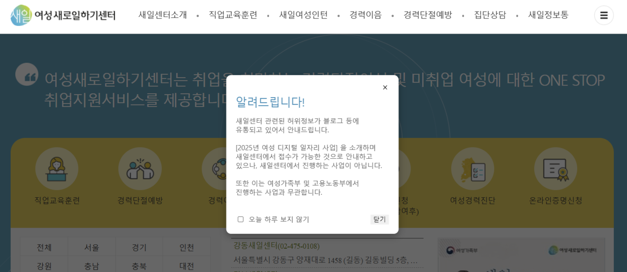 | 최근 온라인상에 ‘여성가족부 산하 기관인 여성새로일하기센터(새일센터)에서 여성 디지털일자리 사업을 주관한다’는 내용의 허위 정보가 유통되고 있다. 이에 따라 여가부는 새일센터 홈페이지에 들어가자마자 볼 수 있는 팝업 공지 등으로 해당 사실을 알리고 있다. [여성새로일하기센터 홈페이지 캡처] |