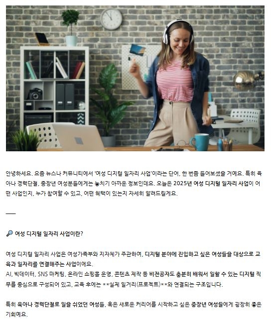 해당 글에는 여성 디지털 일자리 사업을 신청하면 재택근무 형식으로 온라인 쇼핑몰 운영 보조, 블로그 뉴스레터 작성, 데이터 수집·정리 등의 업무를 하며 최대 6개월 동안 월 100~200만원을 벌 수 있다는 식의 내용이 담겼다. “기술이 있든 없든 괜찮다” “장소에 구애받지 않고 자신의 시간을 효율적으로 활용하며 일할 수 있다” 등 혹 할만한 문구들로 유혹한다.