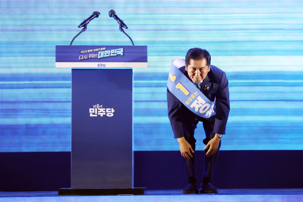 | 지난 8월 2일 정청래 더불어민주당 당대표 후보가 2일 고양 킨텍스에서 열린 전국당원대회에서 정견발표를 한 뒤 큰절을 하고 있다. [연합] |
