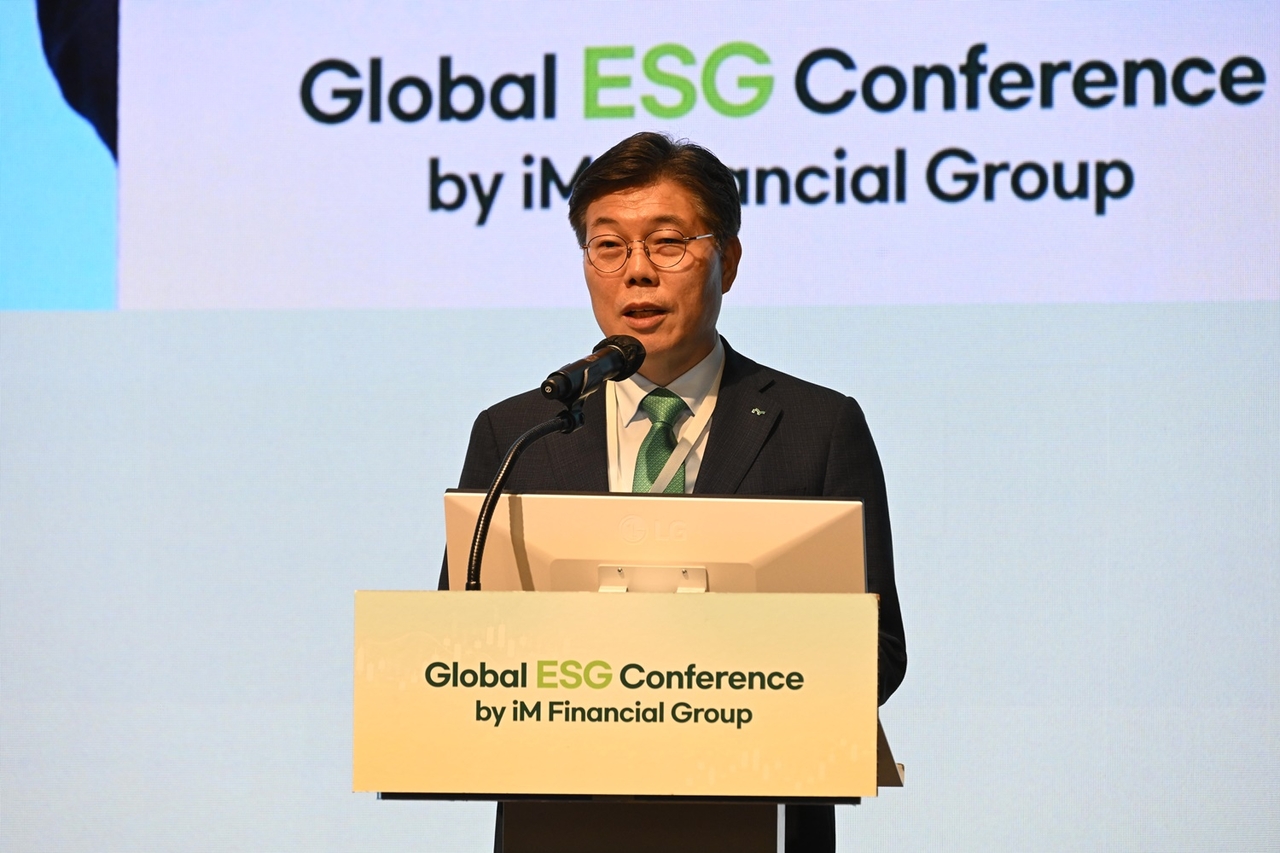 | 지난 6월 iM금융그룹이 주최한 ‘Global ESG Conference’ 행사에서 황병우 회장이 환영사를 하고 있다.[iM금융그룹 제공] |