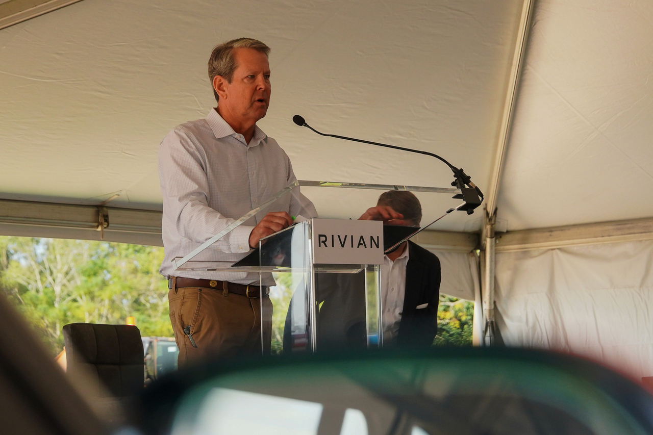 | 지난 16일(현지시간) 미국 조지아주 소셜 서클 외곽의 전기 자동차 제조 공장 부지에서 열린 기공식에서 브라이언 켐프 조지아 주지사가 연설하고 있다. [AP] |