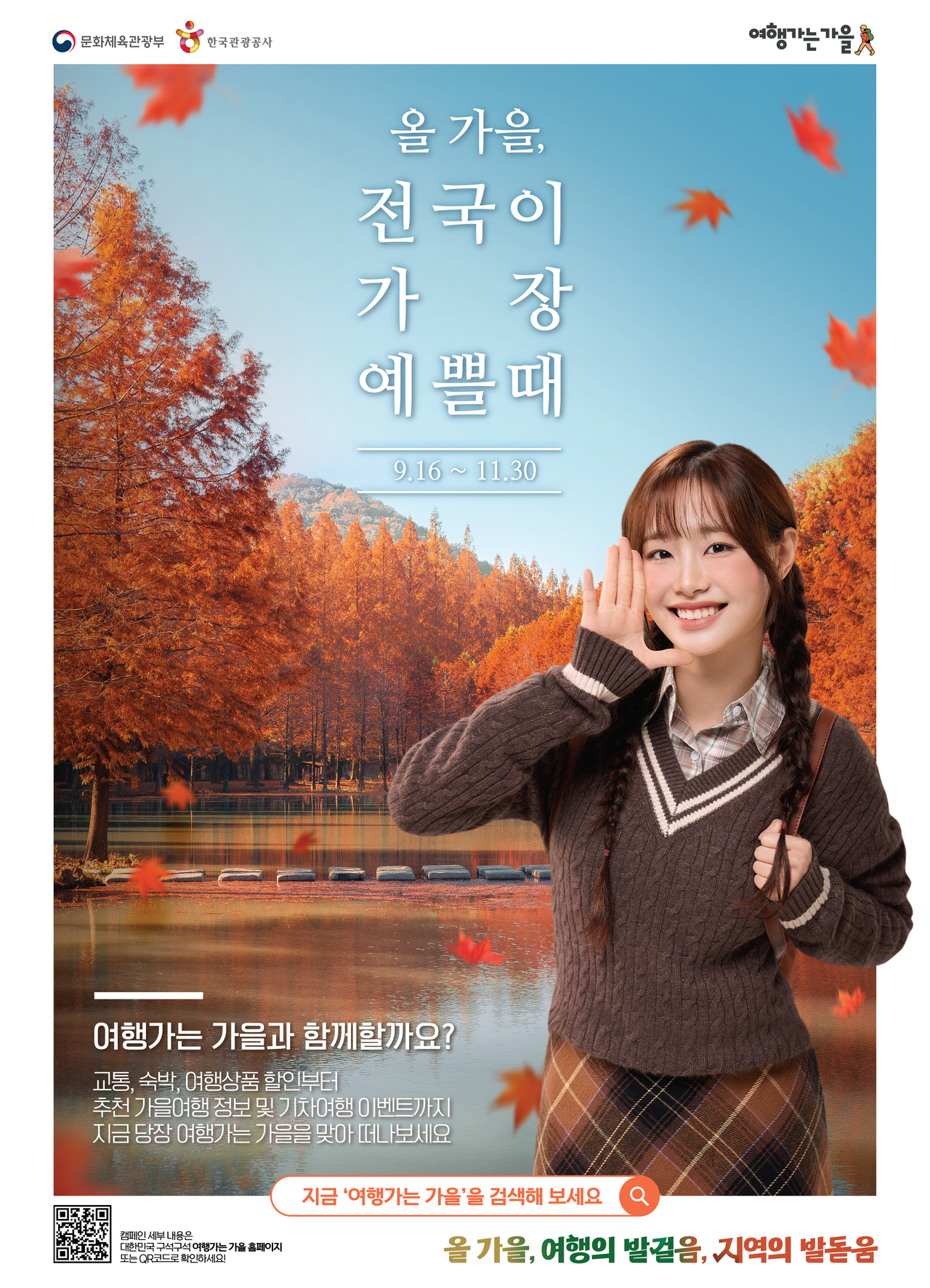 | 정부 4개 부처, 경제 6단체, 17개 시도, 한국관광공사가 추진하는 ‘여행가는 가을’ 대국민 알림 포스터. 가수 ‘츄’가 홍보대사로 나섰다. |
