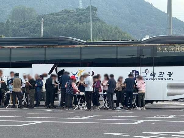 사진을 보면 관광 버스 두 대가 주차돼 있고, 그 사이에 수십 명의 관광객들이 간이 테이블을 빙 둘러싸 서서 음식을 먹고 있다.