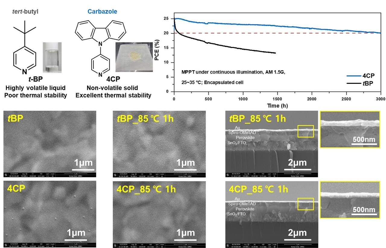 tBP(4-tert-butylpyridine)는 태양전지 안에 리튬 이온을 고르게 분산시키기 위해 넣는 첨가제로, 전지가 태양광을 전기로 바꾸는 효율을 높인다. 하지만 액체 형태라 고온에서 쉽게 휘발되고, 그 과정에서 리튬이온을 제대로 잡아두지 못해 전지 안에 부산물이나 미세한 구멍(핀홀)이 생기게 된다. 이는 전지 수명을 줄이는 주요 원인이다.