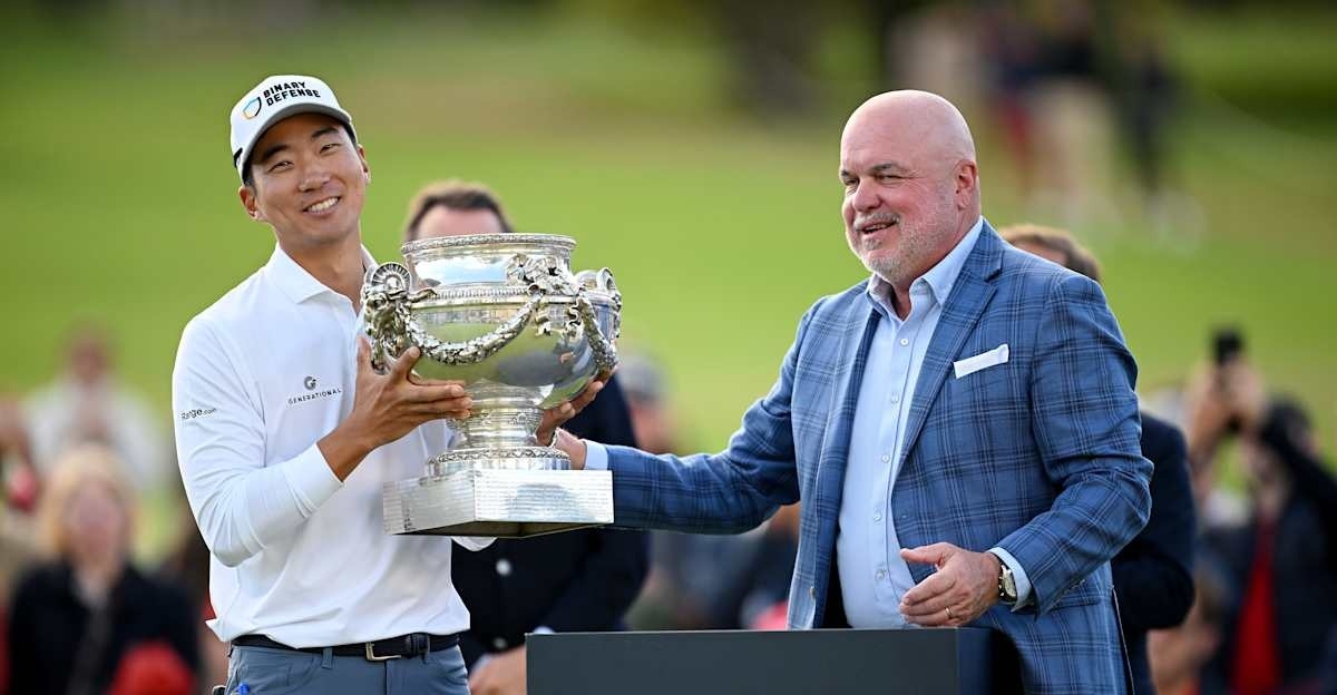 | 우승 트로피를 건네 받으며 웃고 있는 마이클 김. [사진=DP월드투어] |