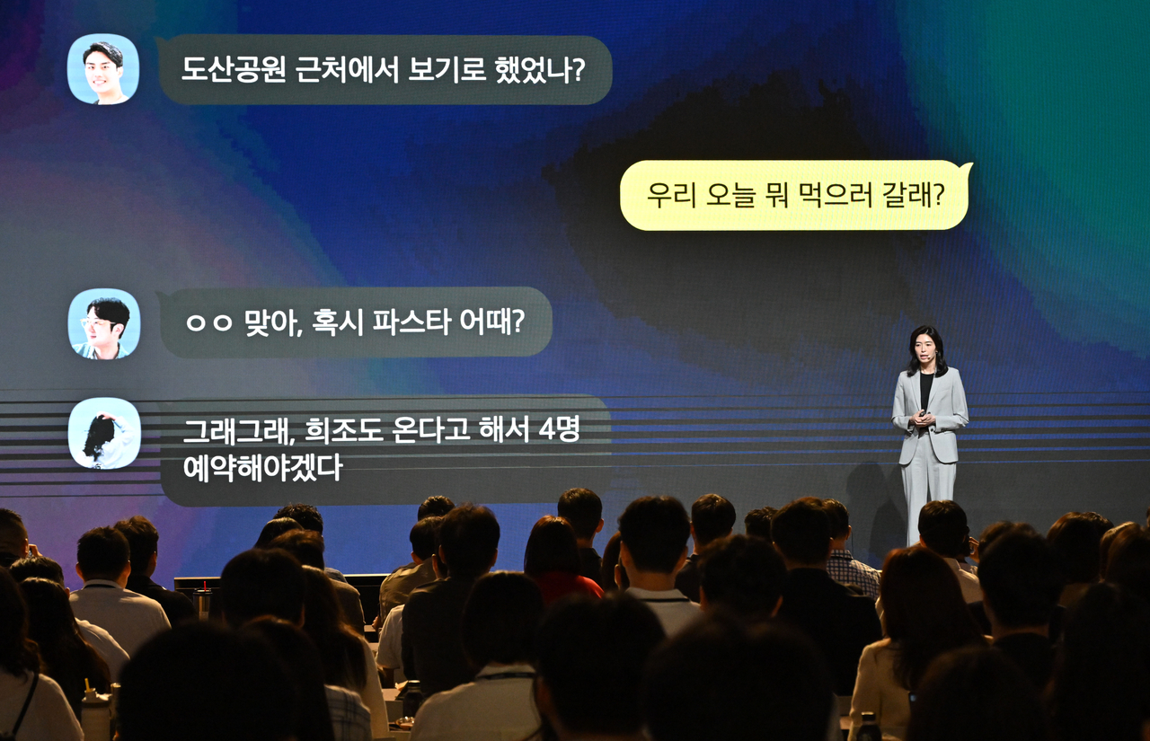 | 23일 경기도 용인시 카카오AI캠퍼스에서 ‘이프 카카오(if(kakao)25)’ 콘퍼런스를 열고 카카오톡의 대규모 업데이트를 공개한 정신아 카카오 대표. [카카오 제공] |