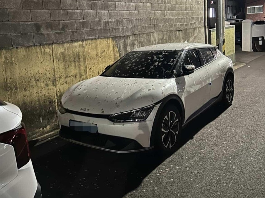 특히 가운데 주차된 흰색 차는 보닛부터 앞 유리, 윗 부분, 창문, 사이드미러까지 이물질이 빼곡하게 묻었다.