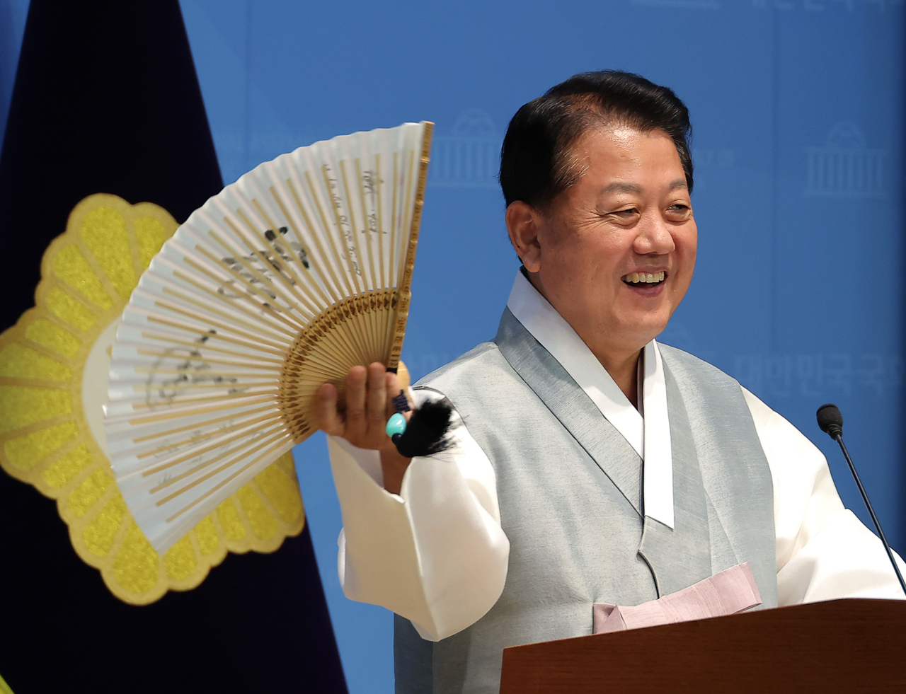 | 김병주 더불어민주당 의원이 15일 서울 여의도 국회 소통관에서 국회 공식행사 때 의원들의 한복 착용을 제안하는 기자회견을 하고 있다. [연합] |