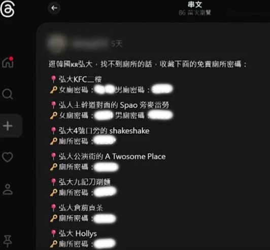 | 한 대만 네티즌이 소셜미디어에 서울 마포구 홍대 상점들의 화장실 비밀번호를 공개했다 [TVBS] |