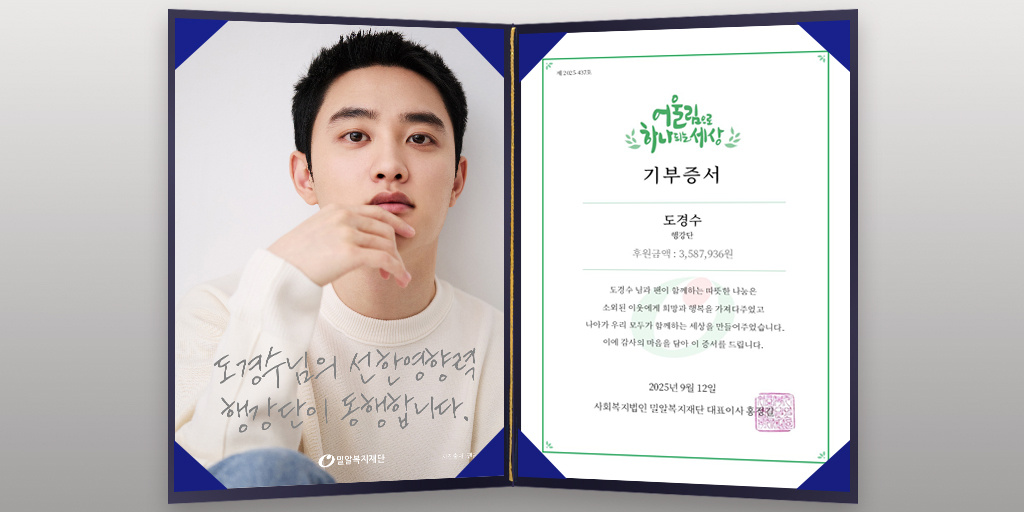 밀알복지재단 정형석 상임대표는 “도경수 씨와 팬덤의 따뜻한 나눔이 의료비 지원이 필요한 장애 아동들에게 큰 힘이 될 것”이라며 “소중한 마음을 모아주신 ‘행강단’에 깊이 감사드린다”고 밝혔다.