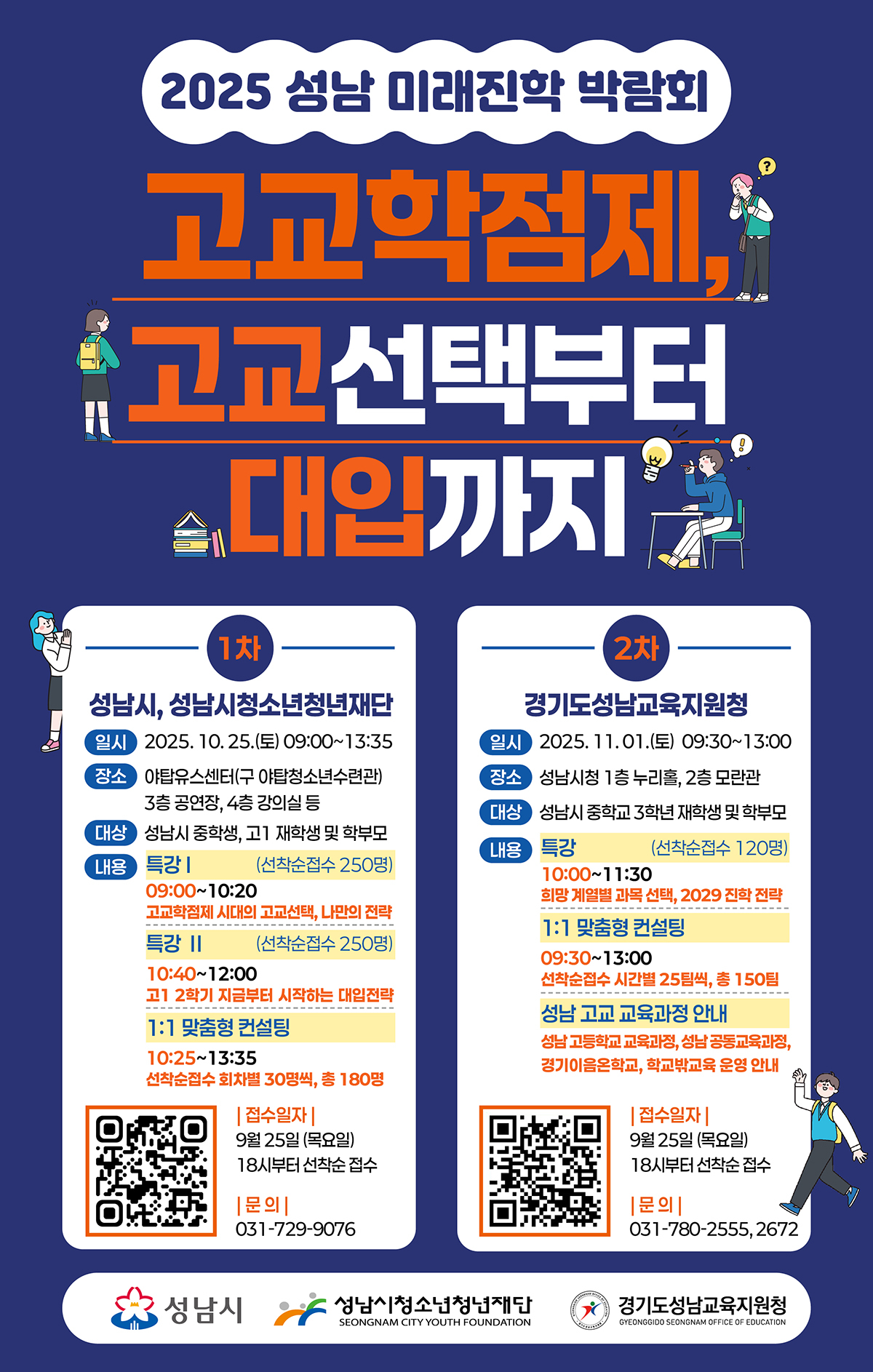 [헤럴드경제(성남)=박정규 기자]성남시청소년청년재단(대표 양경석)과 경기도성남교육지원청은 2025년 고교학점제 전면 시행에 따라 변화하는 교육과정과 진학제도에 대한 정확한 정보를 제공하기 위해 ‘2025 성남 미래진학박람회’를 개최한다.
