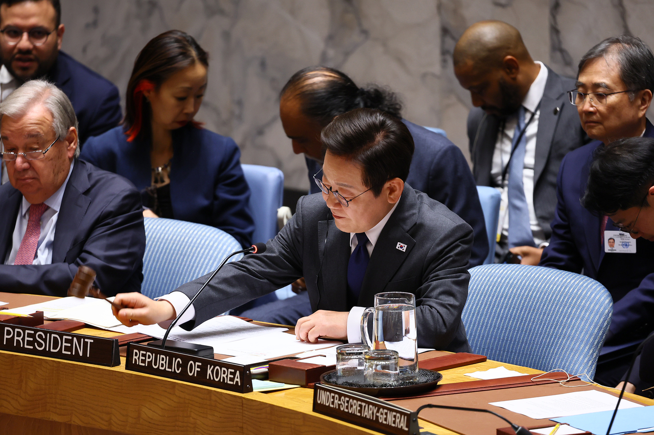 유엔총회 참석을 위해 미국 뉴욕을 방문 중인 이 대통령은 이날 ‘AI와 국제평화·안보’를 주제로 채택한 뒤 의사봉을 두드려 토의 시작을 알렸다.