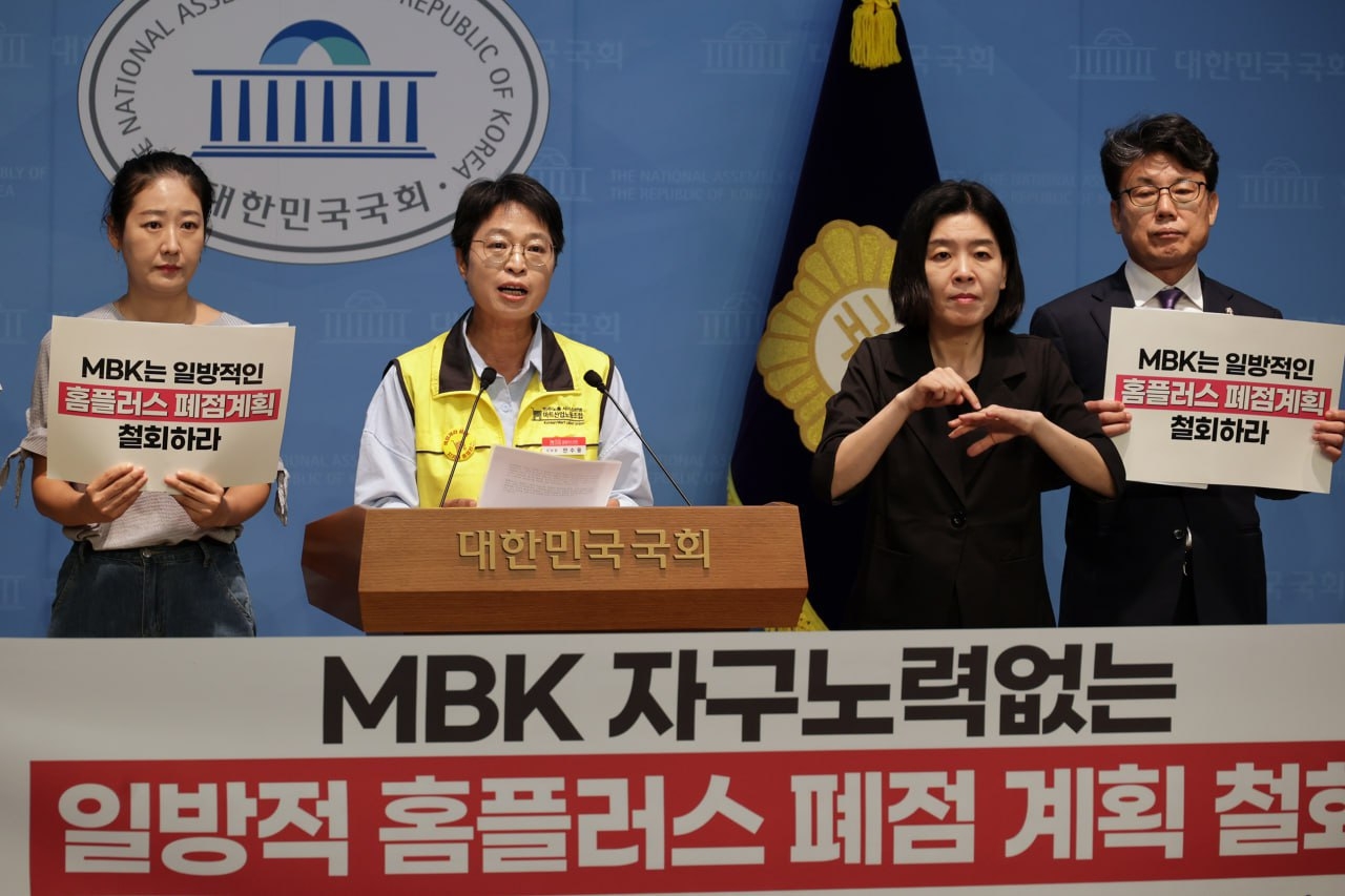 | 지난 8일 국회소통관에서 홈플러스 폐점 계획 철회 기자회견이 열리고 있다. [마트노조 제공] |