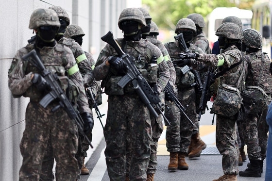 | 정부서울청사 별관에서 진행된 정부서울청사 폭발물 테러 대응 합동훈련에 참가한 군인들이 대기하고 있다. [연합] |