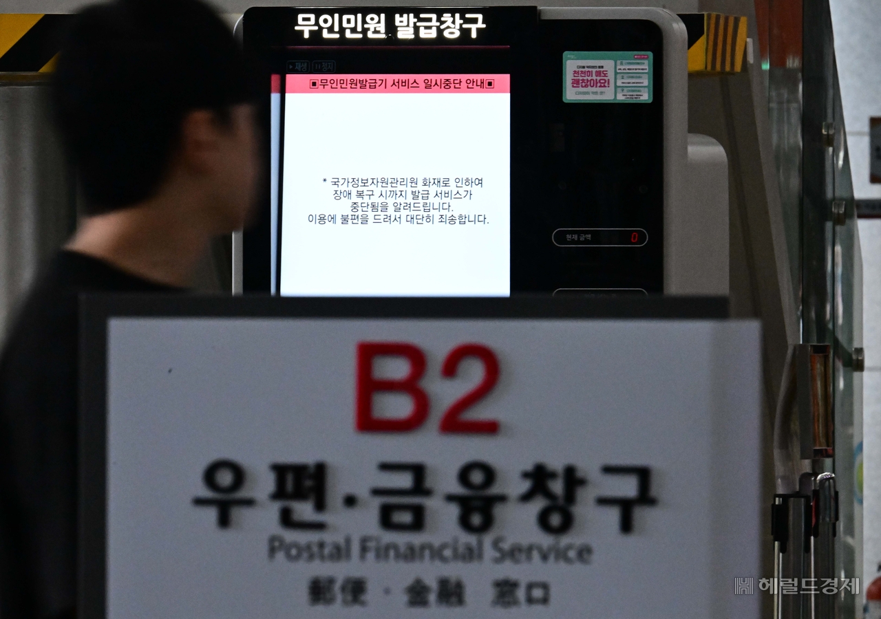 [헤럴드pic] ‘불편을 드려 죄송합니다’ 글꼴 선택 본문 텍스트 크게본문 텍스트 작게 인쇄 [헤럴드경제=이상섭 기자] 대전 국가정보자원관리원(국정자원) 전산실 화재로 우편ㆍ금융 서비스 차질이 생긴 가운데 29일 오전 서울 시내 한 우체국에 설치된 무인민원 발급기에 운영 중단 안내문이 표시되어 있다. 우정사업본부는 이날 국정자원 화재로 중단됐던 서버 시스템을 다시 가동해 금융·보험등 금융관련 서비스는 정상 작동한다고 밝혔다.