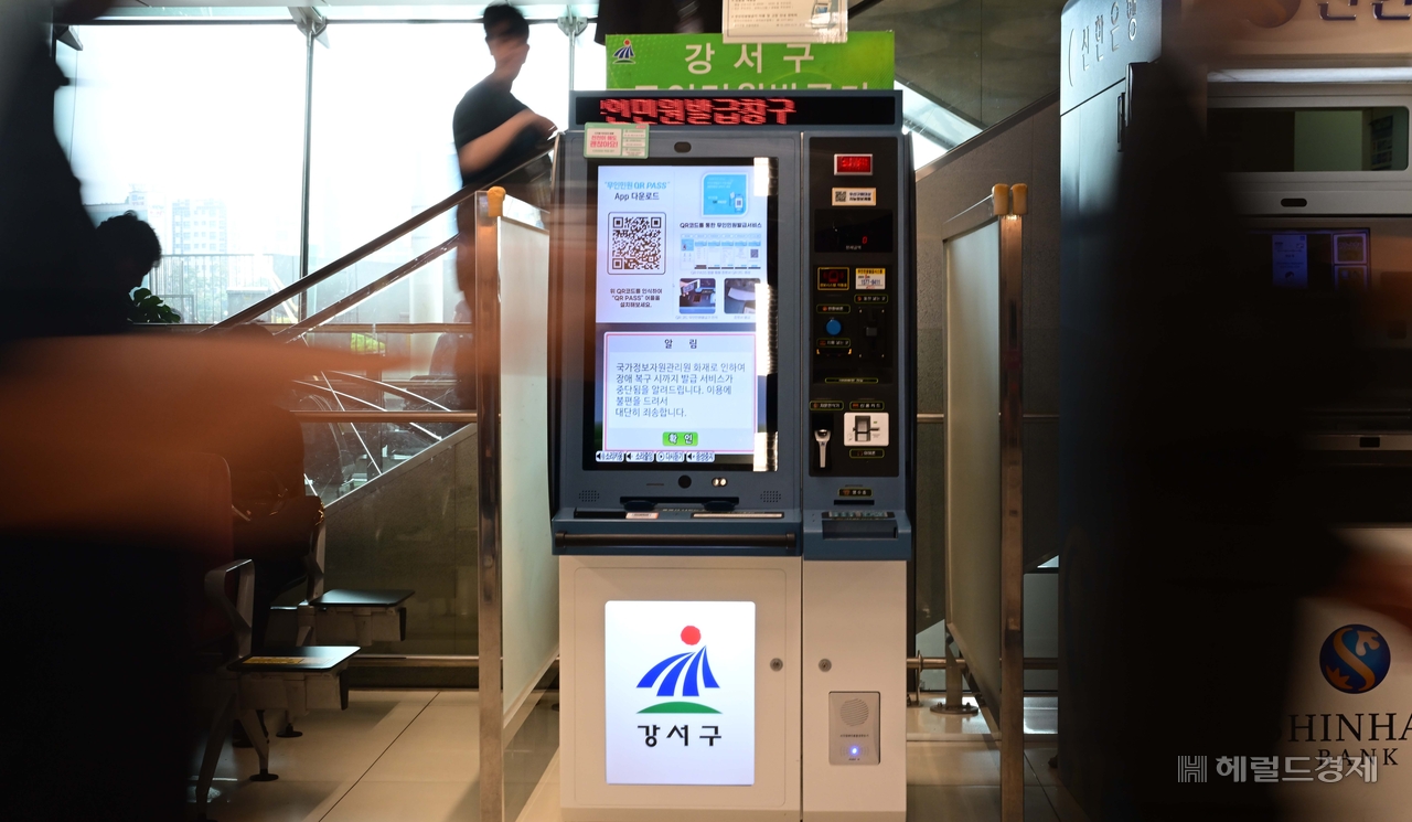 [헤럴드pic] 먹통이 된 무인민원발급기 글꼴 선택 본문 텍스트 크게본문 텍스트 작게 인쇄 [헤럴드경제=이상섭 기자] 대전 국가정보자원관리원(국정자원) 전산실 화재로 무인민원 발급기 이용에 차질이 생긴 가운데 29일 오전 서울 강서구 김포공항 출국장 내에 설치된 무인민원발급기에 운영 중단 안내문이 표시되어 있다.