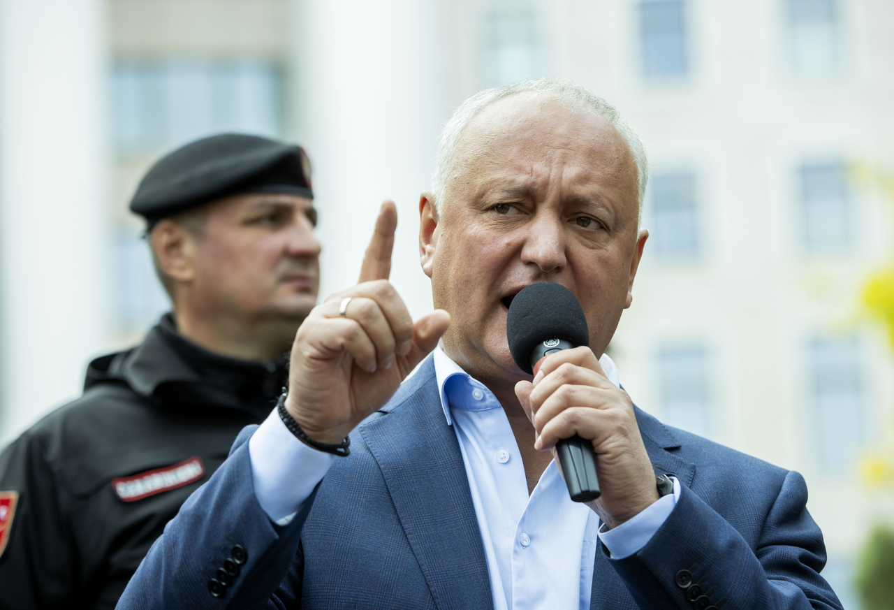 | 애국 블록에 참여하는 사회주의자당의 이고르 도돈 전 몰도바 대통령이 29일(현지시간) 몰도바 의회 청사 앞에서 집회를 열고 발언하고 있다. [EPA] |