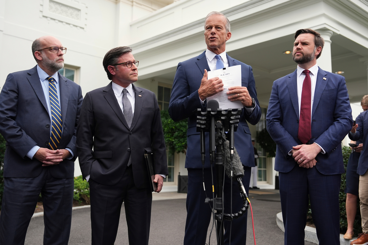 | 미 상하원 지도부와 JD 밴스 부통령이 29일(현지시간) 백악관에서 기자회견을 하고 있다. [AP] |