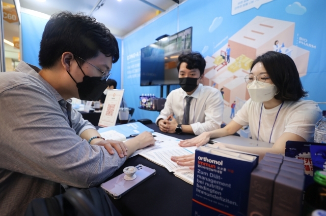 | 취업박람회 기업 부스에서 상담을 받고 있는 취업준비생. [연합] |