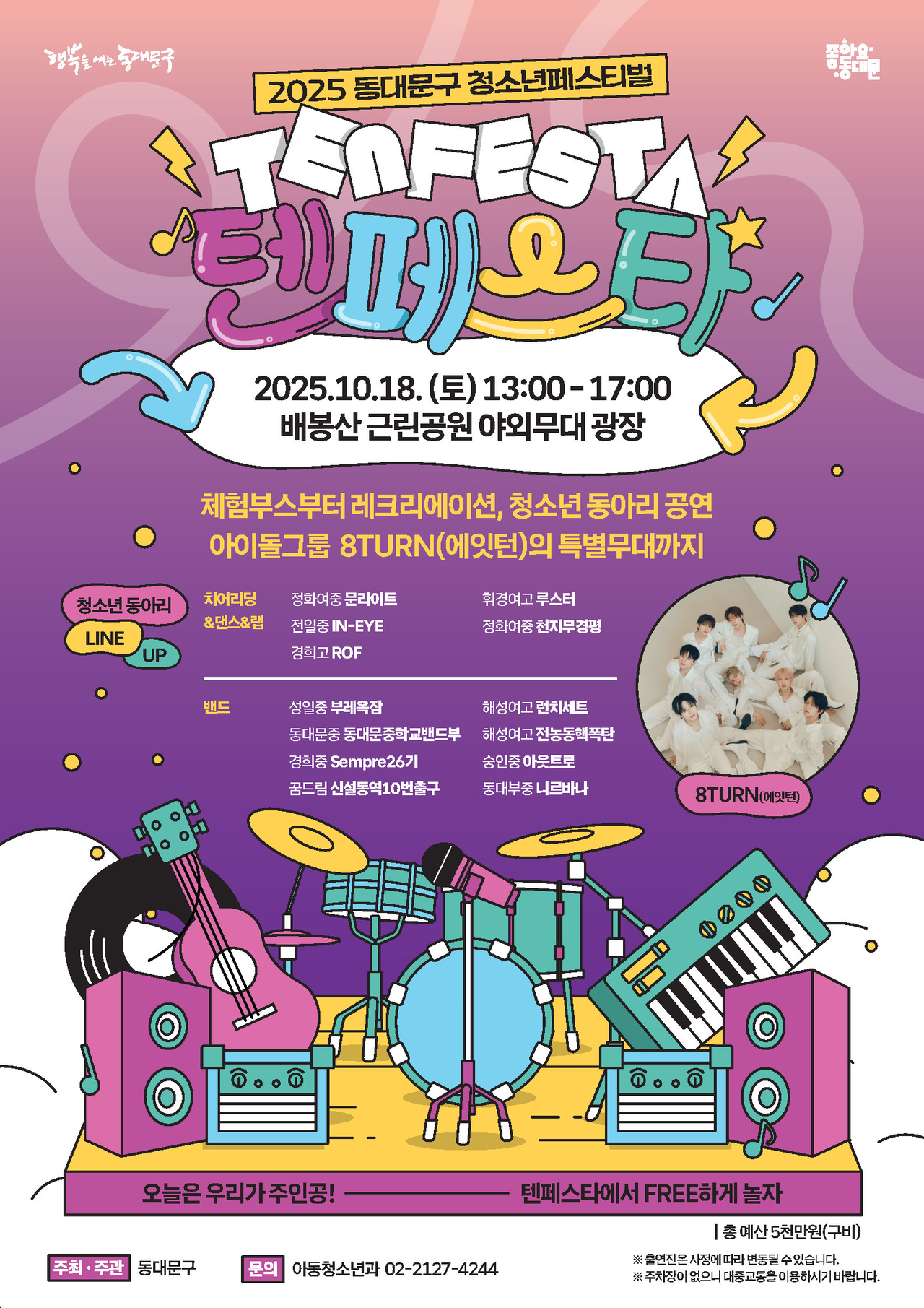 [헤럴드경제=박종일 선임기자]서울 동대문구(구청장 이필형)는 오는 18일 오후 1시부터 5시까지 배봉산근린공원 열린광장에서 2025 동대문구 청소년 페스티벌 ‘텐 페스타(TEN FESTA)’를 개최한다.
