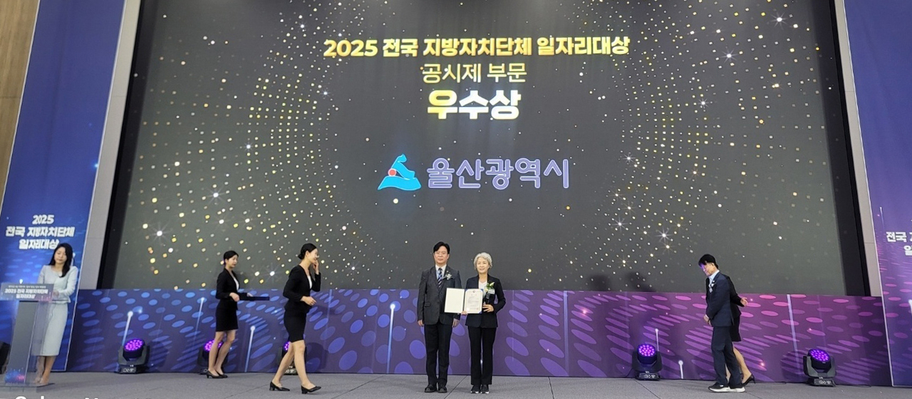| 울산시가 30일 청주 오스코에서 열린 고용노동부 주관 ‘2025 전국 지방자치단체 일자리대상’에서 공시제 부문 우수상을 수상하고 있다. [울산시 제공] |