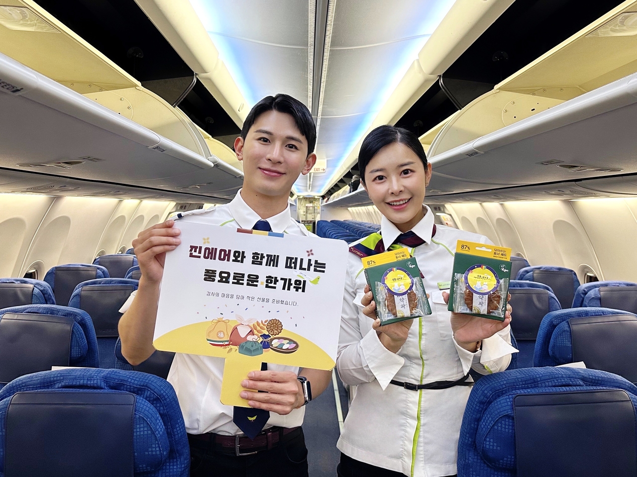 먼저 추석 연휴가 시작되는 10월 5일 김포공항 국내선 탑승구에서는 일부 항공편 탑승객을 대상으로 특별한 선물을 전달한다. 이날 LJ659편(김포~포항), LJ651편(김포~사천), LJ505편(김포~제주), LJ655편(김포~울산) 탑승객에게는 전통 명절 간식인 약과 등을 증정한다. 또 진에어의 기내 유상 판매 서비스 ‘지니홈배송’에 입점한 브랜드 ‘야다’와의 협업을 통해 화장품 샘플이 추가로 제공된다.