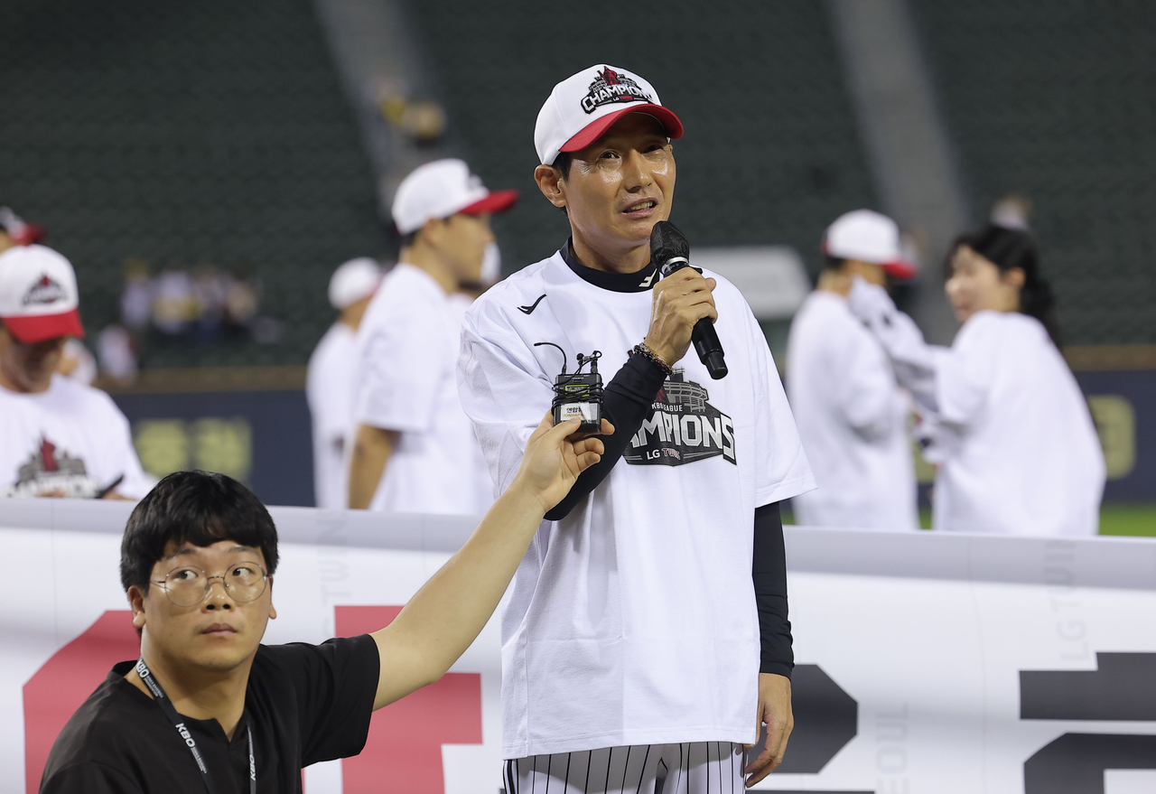 | LG 트윈스 염경엽 감독이 정규 시즌 우승을 확정한 뒤 소감을 말하고 있다. [연합] |