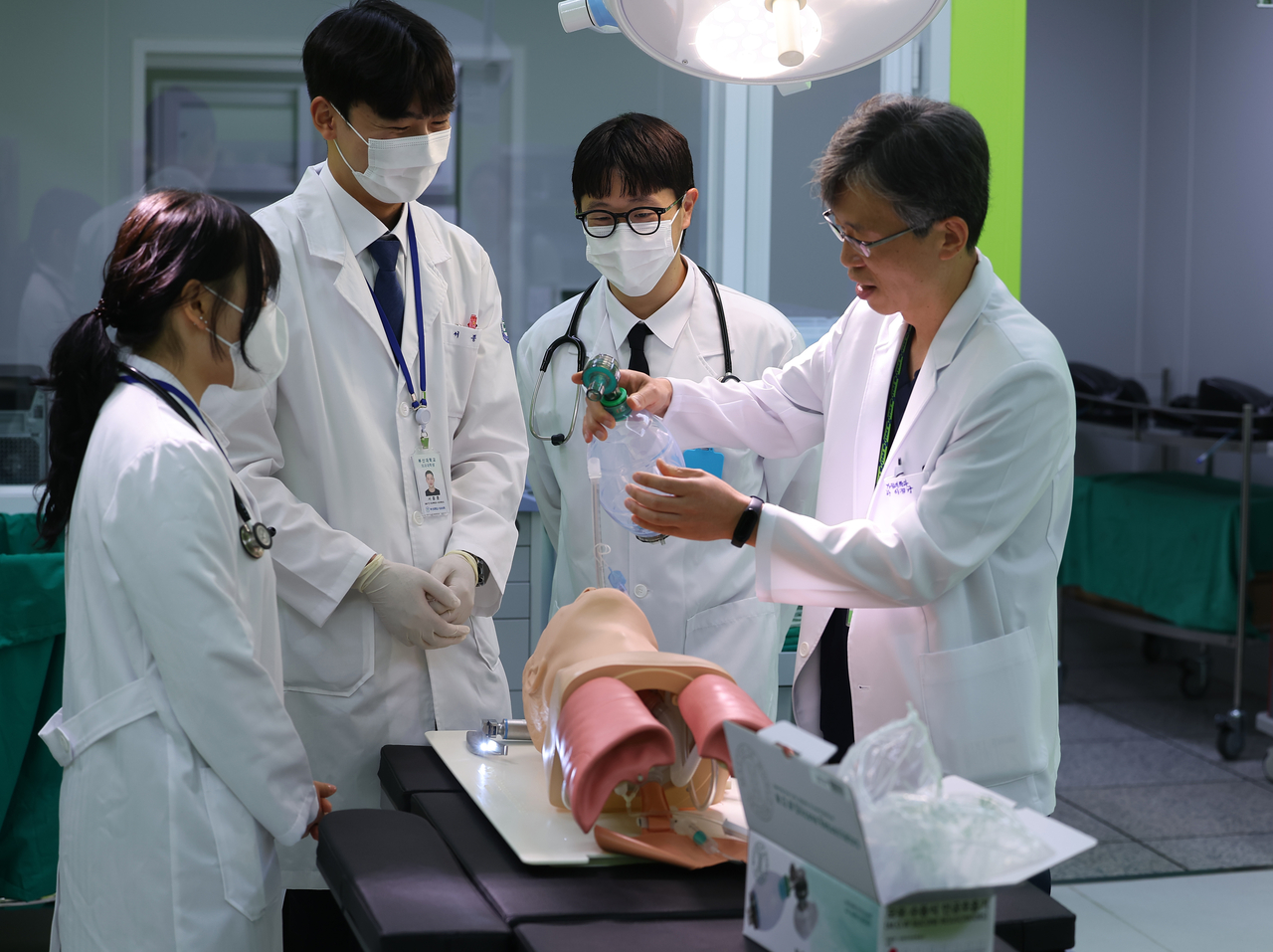 | 지난 8월11일 부산 서구 부산대학교 글로컬임상실증센터에서 부산대 의대 본과 3학년 학생들이 복귀 후 첫 실습수업에 참여하고 있다. [연합] |