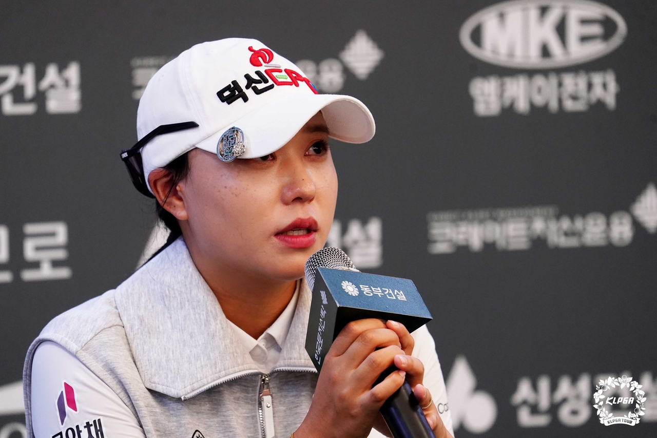 | 대회 이틀째 선두에 오른 문정민이 기자들의 질문에 대답하고 있다. [사진=KLPGA] |