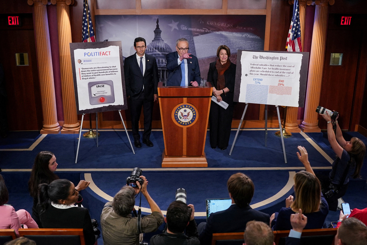 | 미국 상원 소수당 척 슈머(가운데) 원내대표, 브라이언 샤츠(왼쪽) 상원의원, 에이미 클로부샤 상원의원이 3일(현지시간) 미국 워싱턴 D.C. 국회의사당에서 미국 연방정부 셧다운 관련 기자회견을 하고 있다 [연합로이터] |