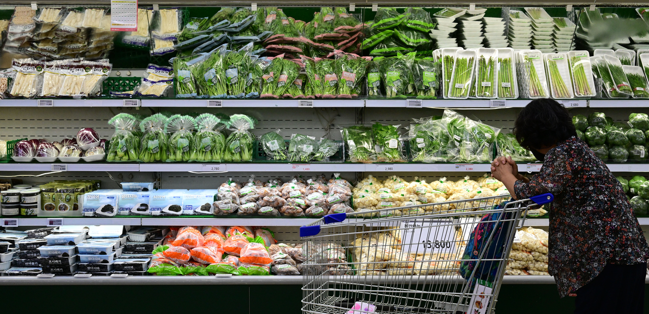 | 지난 7월 서울 농협 하나로 마트 양재점 직원이 야채코너 상품들을 진열하고 있다. 박해묵 기자 |