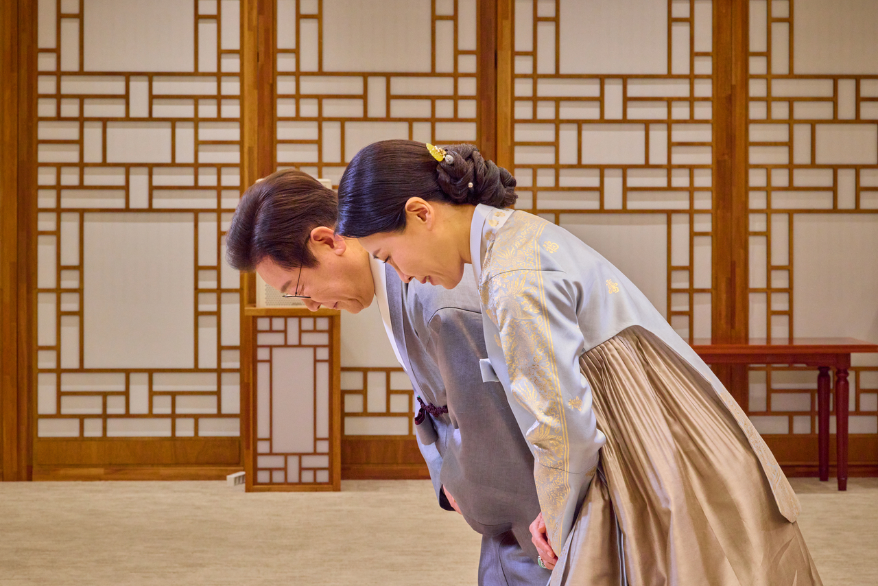 | 이재명 대통령과 김혜경 여사가 한복 차림으로 명절 인사를 하고 있다.[연합] |