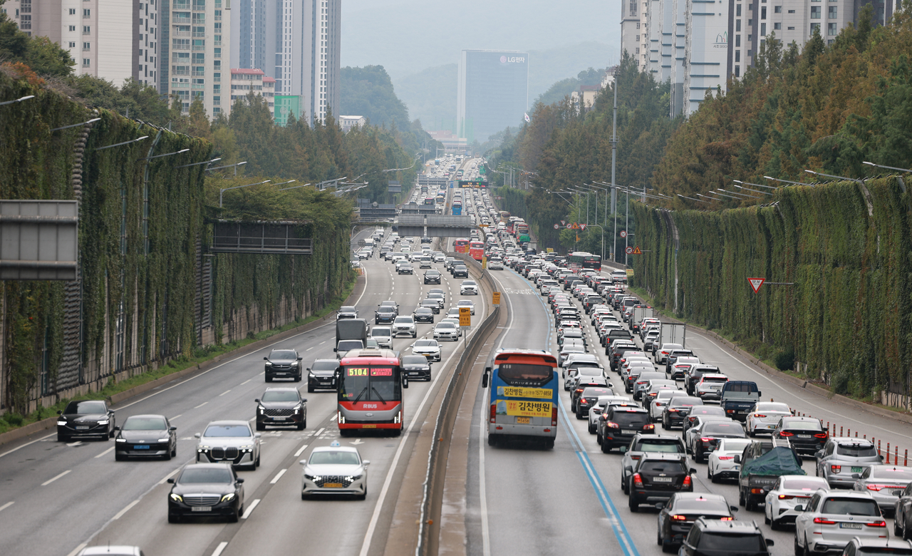 | 추석 연휴 첫날인 3일 경부고속도로 서울 잠원나들목 인근 하행선이 정체를 빚고 있다. <연합뉴스> |