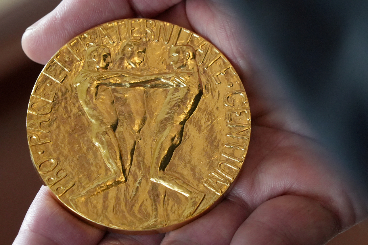 | 노르웨이 노벨 연구소 직원이노르웨이 오슬로에 있는 연구소에서 노벨 평화 메달 복제품을 들고 있는 모습. [로이터] |
