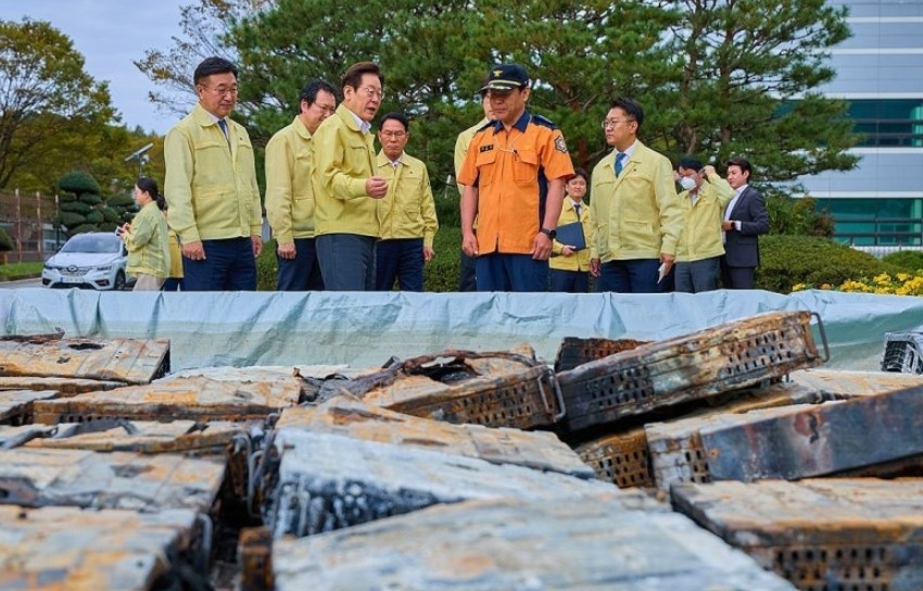 | 이재명 대통령이 10일 화재 피해 복구작업이 진행 중인 대전 유성구 국가정보자원관리원 대전 본원을 찾아 화재 진압을 위해 외부로 옮겨진 배터리들을 살펴보고 있다. [연합] |