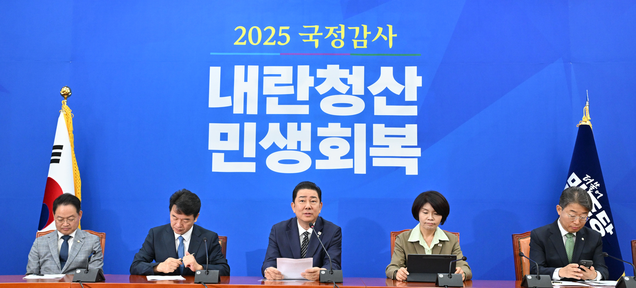 | 김병기(가운데) 더불어민주당 원내대표가 14일 오전 서울 여의도 국회에서 열린 국정감사대책회의에 참석해 발언을 하고 있다. 임세준 기자 |