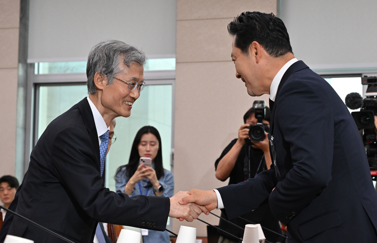 | 조희대(왼쪽) 대법원장이 지난 13일 오전 국회 법제사법위원회에서 열린 대법원 등에 대한 국정감사에 참석해 장동혁 국민의힘 대표와 인사하고 있다. 임세준 기자 |