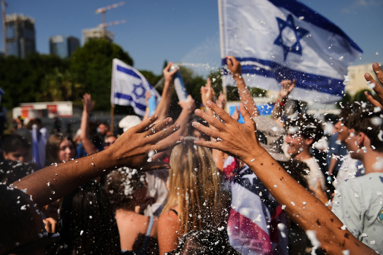 | 13일(현지시간) 하마스에서 석방된 인질들이이스라엘 병원에 도착하면서 이스라엘 국민들이 국기를 들고 환호하고 있다. [AP] |