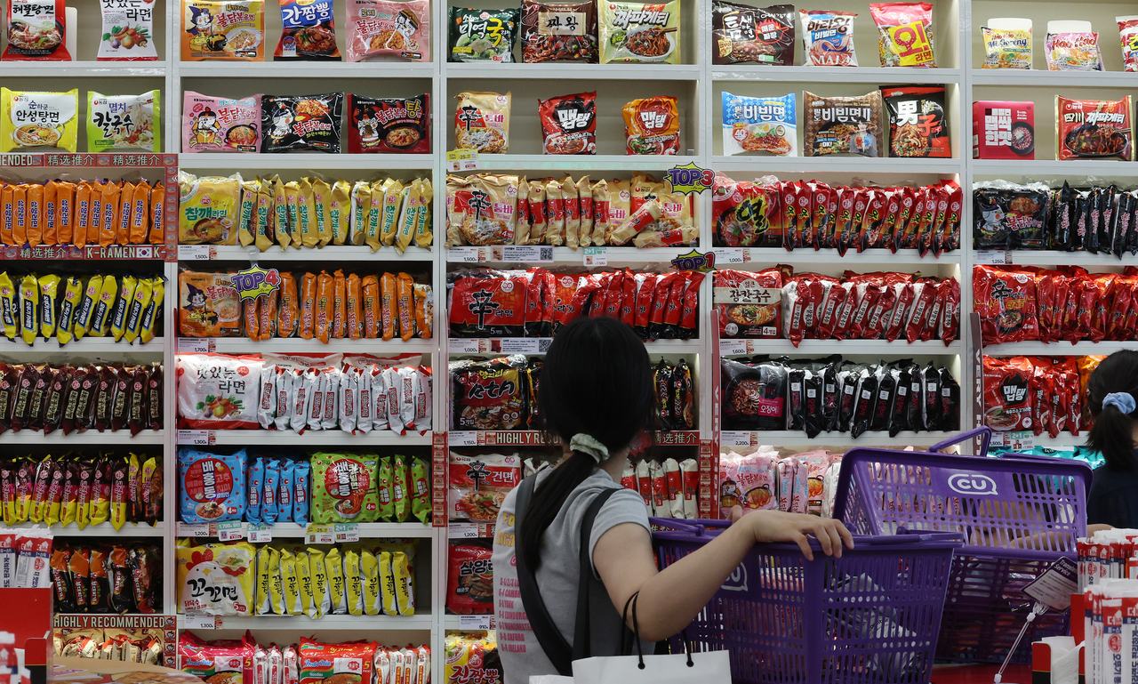 | 서울 마포구 CU 홍대상상점 라면 라이브러리를 찾은 고객이 라면을 살펴보고 있다. [연합] |