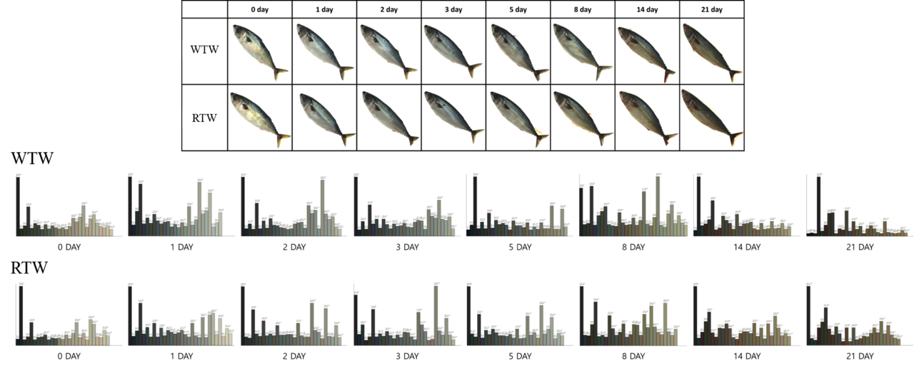 연구팀은 고등어의 해동방법에 따라 품질에 어떤 차이가 발생하는지 확인하고 실시간 분석을 위해 실온 해동(이하 RT)과 흐르는 물 해동(WT) 두 가지 방식을 적용했다. 급속 동결(-20℃)시킨 고등어를 두 가지 방식으로 해동하여 저장하면서 이화학적 성분분석, 미생물 검사, 조직감 평가, 색상 분석을 수행하였고, 초분광 영상 데이터를 AI 기반 분석 기법인 PLS-DA 모델에 적용하여 해동 방법별 분류 가능성을 평가했다.