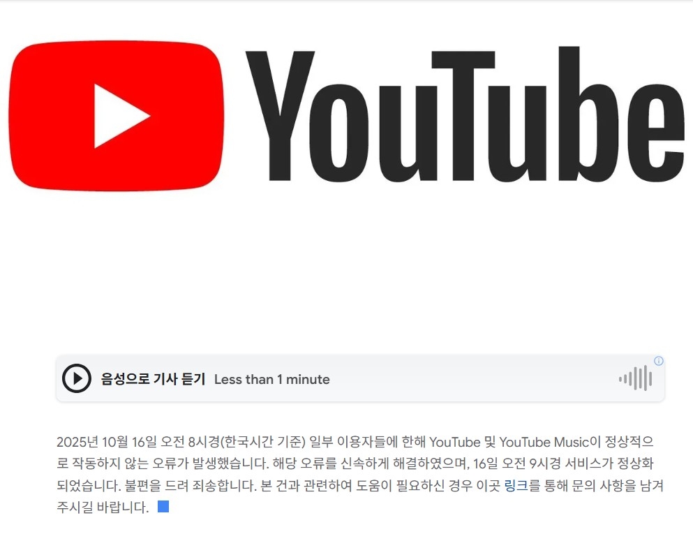 구글코리아는 자사 블로그를 통해 “일부 이용자들에 한해 유튜브 및 유튜브 뮤직이 정상적으로 작동하지 않은 오류가 발생했다. (중략) 불편을 드려 죄송하다”면서도 오류 원인에 대해서는 과기정통부에만 “스팸 방지 기능 업데이트 중 발생했다”고 구두 보고한 것으로 알려졌다.