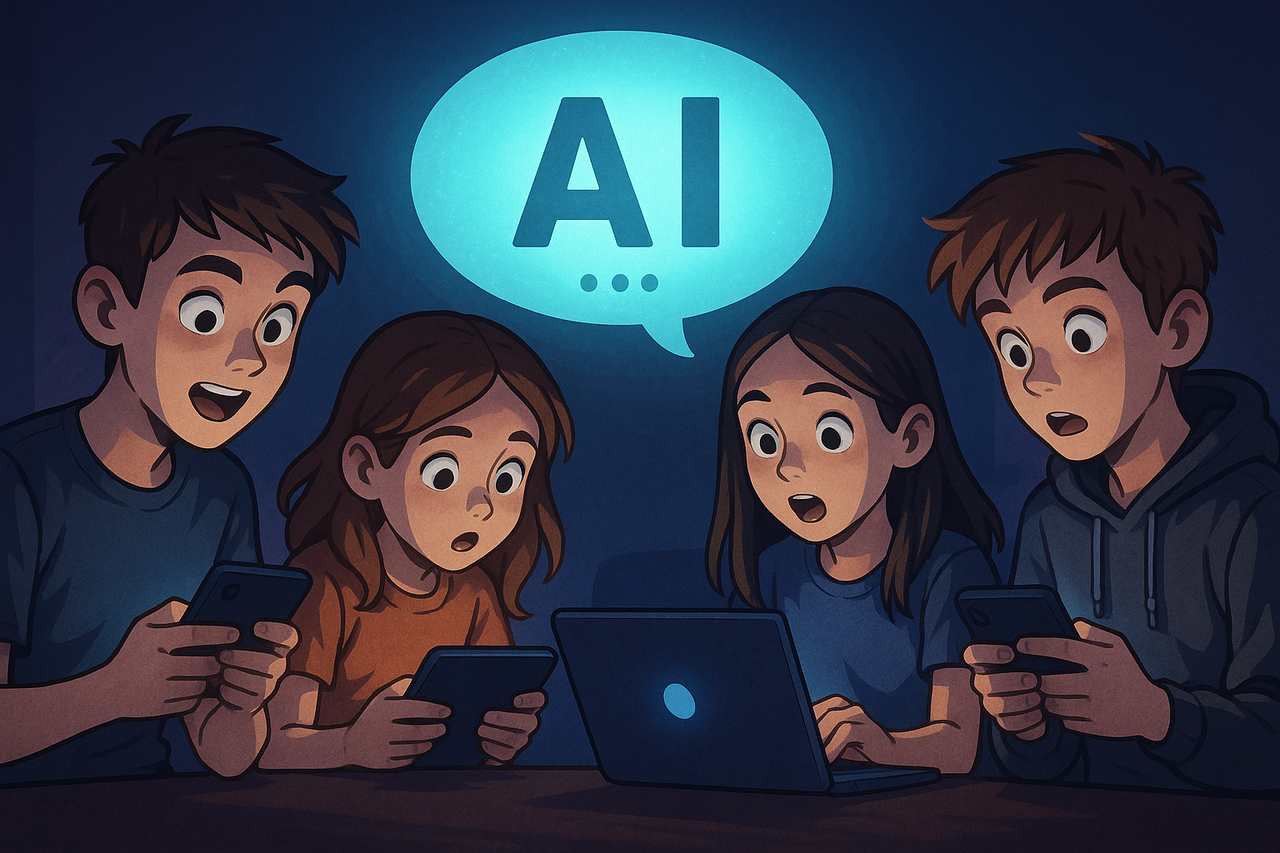 | 대형언어모델(LLM) 기반 AI 챗봇에 의존하는 청소년들. [챗GPT로 구현한 이미지] |