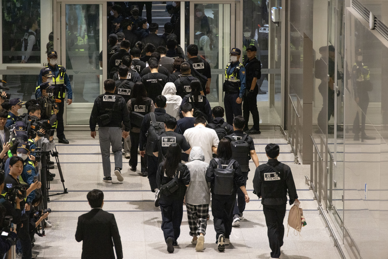 | 캄보디아 온라인 사기에 가담해 구금된 한국인들이 지난 18일 오전 인천국제공항 제2터미널을 통해 송환되고 있다. 이날 송환에는 경찰 호송조 190여명이 투입됐다. [연합] |