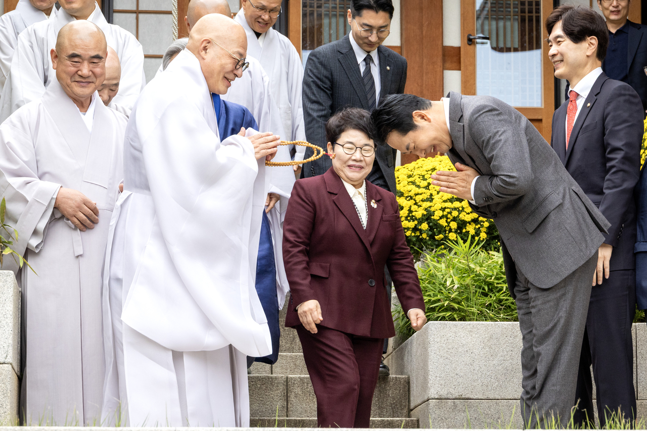 | 장동혁 국민의힘 대표(오른쪽)가 21일 서울 강남구 봉은사를 찾아 대한불교조계종 총무원장 진우스님을 예방해 환담을 마친 후 합장하며 인사하고 있다. 2025.10.21 [연합] |