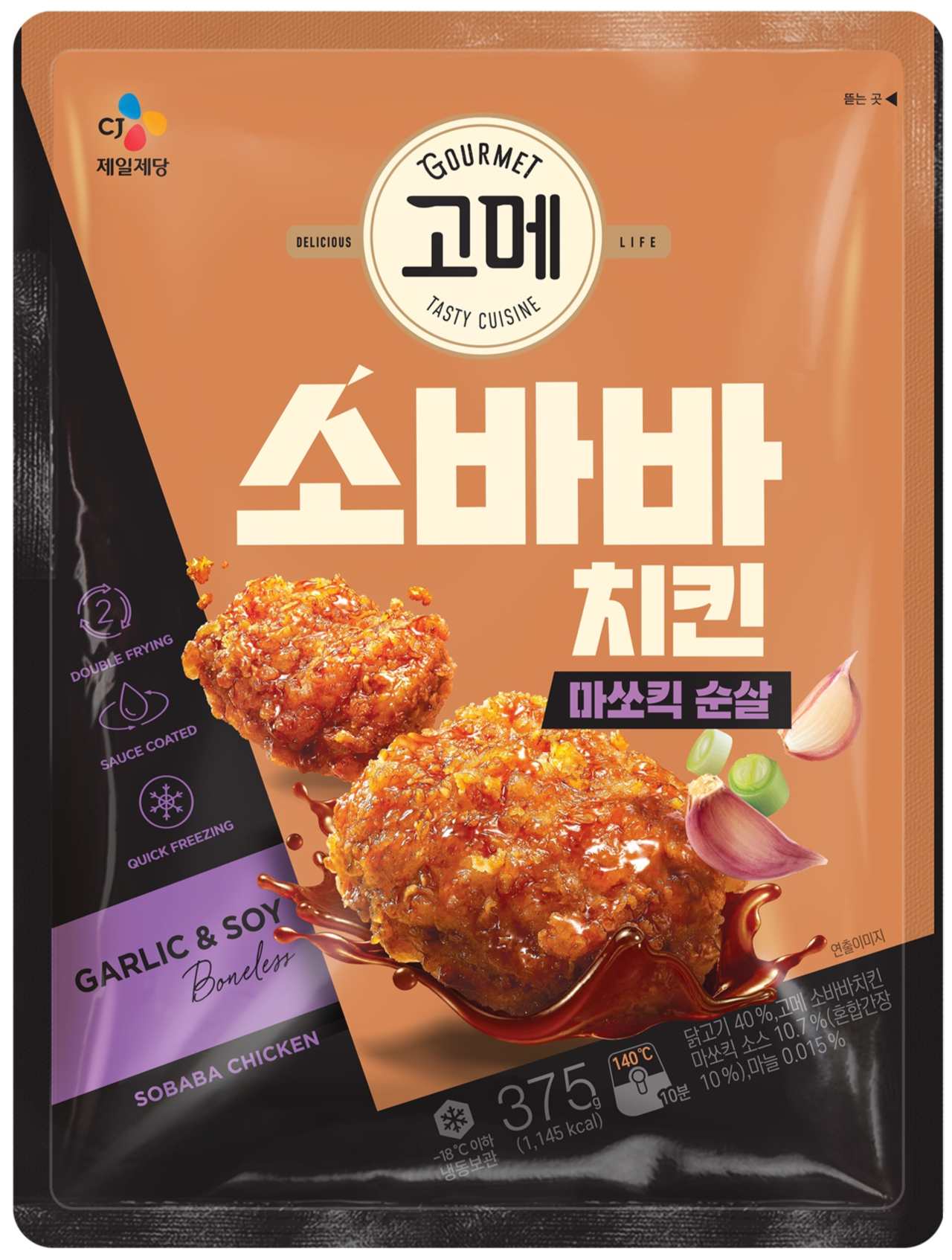 CJ제일제당이 ‘소이허니’, ‘양념’에 이어 세 번째로 선택한 맛은 마늘이다. 신제품 ‘고메 소바바치킨 마쏘킥(마늘쏘이킥) 순살’은 대파와 고추향을 담은 매콤한 간장 소스에 마늘로 감칠맛을 더했다.