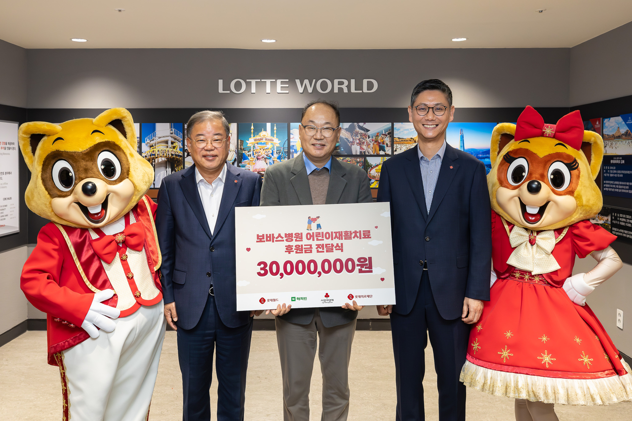 | 롯데월드, 보바스병원 어린이재활센터 기부금 전달. 왼쪽부터 김천주 롯데의료재단 이사장, 윤연중 하남보바스병원 병원장, 권오상 롯데월드 대표이사 |