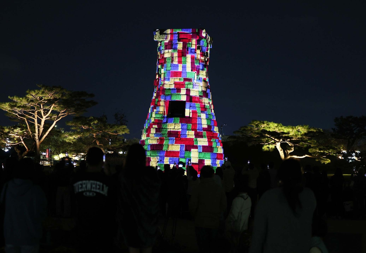 | 20일 오후 경북 경주시 인왕동 첨성대에서 2025 아시아태평양경제협력체(APEC) 정상회의 개최를 기념하는 미디어아트가 진행되고 있다. [연합] |